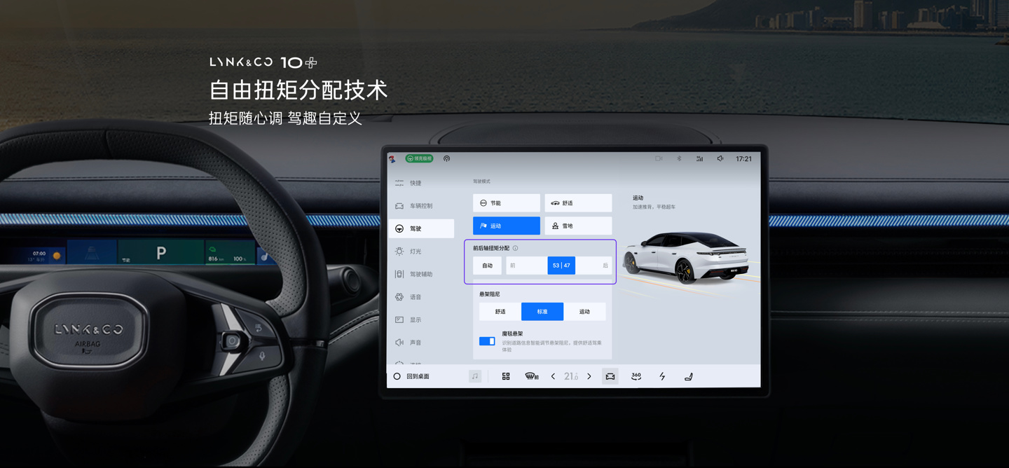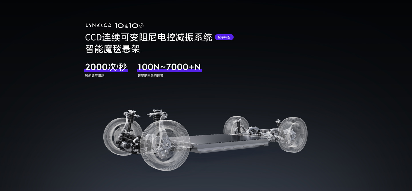 同时,领克 10 全系标配 CCD+ 智能魔毯悬架,每秒智能调节阻尼 2000 次,并支持 100-7000+N 超宽范围动态调节。