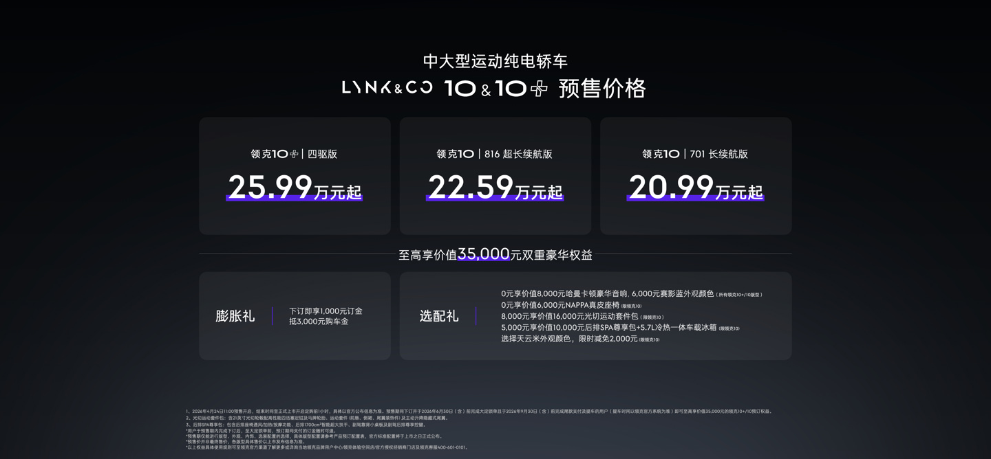 IT之家 4 月 24 日消息,在今天上午的 2026 北京车展上,领克 10 / 领克 10+ 中大型运动纯电轿车正式开启预售。此次发布的新车提供领克 10 701 长续航版、领克 10 816 超长续航版、领克 10+ 四驱版三种配置,预售价分别为 20.99 万元起、22.59 万元起、25.99 万元起。