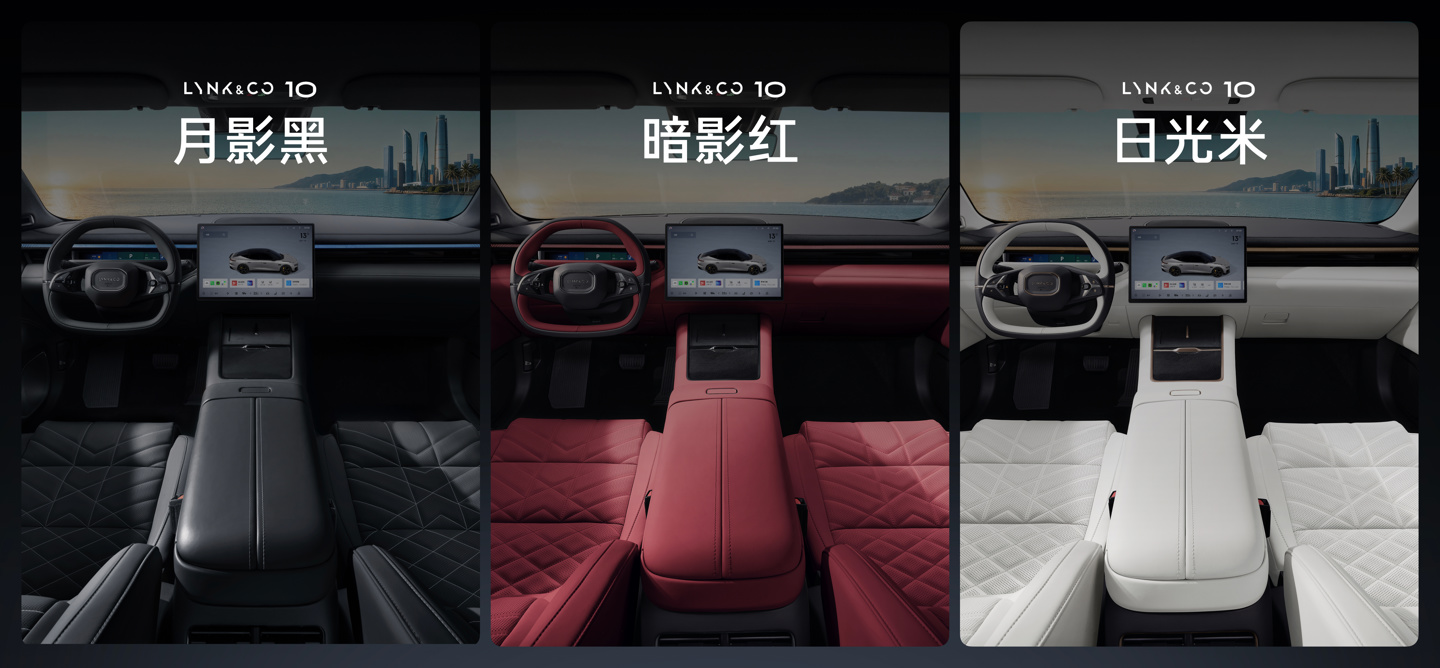 领克 10 则可选月影黑、暗影红、日光米三款内饰配色。